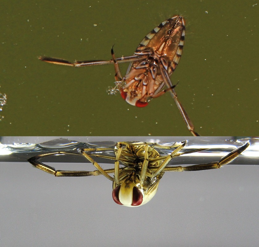 a backswimmerThe backswimmer or water boatman (Notonecta glauca) is an insect that lives in fresh water, especially in ponds, and eats small invertebrates. In other words, it's a carnivore, a predator. It can swim anywhere underwater, but it us usually just under the surface. It's called a "backswimmer" because it swims on its back; and a "water boatman" because it moves around with one long pair of legs that look like the oars of a little boat. Notonecta images by Julie Gallagher, Creative Commons BY 2.0, and fuentedelateja, Creative Commons BY-SA 2.0 |