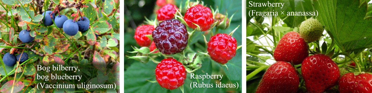 a berryIn everyday English, a berry is any small soft fruit that doesn't have a stone like a cherry. When we think of "berries", we think of the blueberry/bilberry, cranberry, gooseberry, redcurrant, blackcurrant, raspberry, strawberry or blackberry. A lot berries are edible, but some nice-looking berries are poisonous, for example those of Atropa belladonna or deadly nightshade. If you're a botanist, part of your job is to classify plants logically, according to their development and structure. If you look at the first five berries we've mentioned (blueberry/bilberry, cranberry, gooseberry, redcurrant and blackcurrant) you'll see they are simple globes - even though the gooseberry is a strange hairy thing that looks like a small kiwifruit. They are true botanical berries. However, if you look at the photo you'll see that a raspberry is made up of about a hundred little "drupelets", and a strawberry is something else again. The botanical definition of a berry is a fruit that starts off as a flower with a single ovary; it has two or more seeds (so a cherry isn't a berry, because it only has one seed); and it has a skin (exocarp), a soft juicy layer (mesocarp) and a central area with seeds (endocarp). That means grapes, tomatoes and even pomegranates, bananas and watermelons are also technically "berries"! Berry images by Ole Husby (bilberry), Creative Commons BY-SA 2.0; Ben Stephenson (raspberry), Creative Commons BY-SA 2.0; Richard Lewis (strawberry), Creative Commons BY-SA 2.0 |