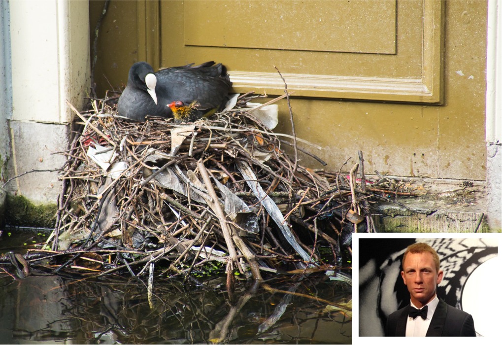 to brood, a broodThis word relates to eggs. "Brooding" is when a parent animal stays very close to its eggs, so as to protect them. A snake or fish "broods" its eggs to protect them from predators. Some fish "mouthbrood" to protect their eggs. For some time after they hatch, the baby fish stay close to the parent and quickly go into the parent's mouth for protection from predators. Some adult fish, amphibians and invertebrates have a "brood pouch" which is a body cavity that eggs and small babies can stay in for protection. A bird broods its eggs partly to protect them from predators and partly to keep them warm (incubation). It does this by sitting on them. An adult bird with eggs may have a "brood patch", which is an area of bare skin on the abdomen. This gives direct contact between the eggs and the parent's skin, which helps keep the embryos warm and hydrated. You can say that a hen is "broody" when it's only interested in making a nest and getting some eggs to sit on. "A brood" is one set of babies for one pair of birds. For example, "barn owls have only one brood per year". By extension, you can say that a person is "brooding" if they look unfriendly and seem to be thinking about a problem. Or thinking that you're a problem. For example, in the BBC series of Jane Austen's novel Pride & Prejudice, Colin Firth played the Darcy character as a "brooding romantic hero". I will never understand why women like "brooding" men. Colin Firth says he played Darcy as somebody "completely and utterly dislikeable, unsympathetic, judgemental and snobbish", and even he doesn't understand why women like Darcy. See also Daniel Craig's James Bond, Jon Snow in Game of Thrones, and every male vampire ever. You can even say that a landscape is "brooding" if it is dark, still and unfriendly. Try a Google image search on "brooding". Image of mother and baby coot (Fulica atra) by Graeme Anderson, Creative Commons BY 2.0 and of Daniel Craig as James Bond by Luke Rauscher, Creative Commons BY 2.0. |