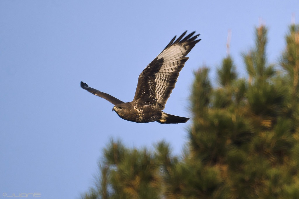 a buzzardThe buzzard (Buteo buteo) is a handsome, medium-sized bird of prey. It looks and acts like a small eagle. It will eat dead animals (scavenging) but it is also a predator that will catch anything from a beetle or an earthworm to a big rabbit that weighs more than the buzzard. Buzzards eat a lot of small mammals such as voles and mice. In Scotland, nearly half their diet is rabbits, and in Italy nearly half their diet is birds, particularly blackbirds (Turdus merula). The buzzard is quite common in Britain and the rest of Europe. If you go for a walk in the countryside, there is a good chance you will see one, two or even three buzzards flying high above a wood, making slow circles; or you may hear their characteristic cry, which sounds a bit like "Keeeeeeee". I once lived in an old farm cottage in Devon, and a pair of buzzards nested in a tree in the middle of a field, about 100 metres from my bedroom window. When they had three or four babies, the noise at 5am on a summer morning sometimes made it hard to sleep. Image of Canary Islands subspecies Buteo buteo insulorum by Juan Emilio, Creative Commons BY-SA 2.0. |
