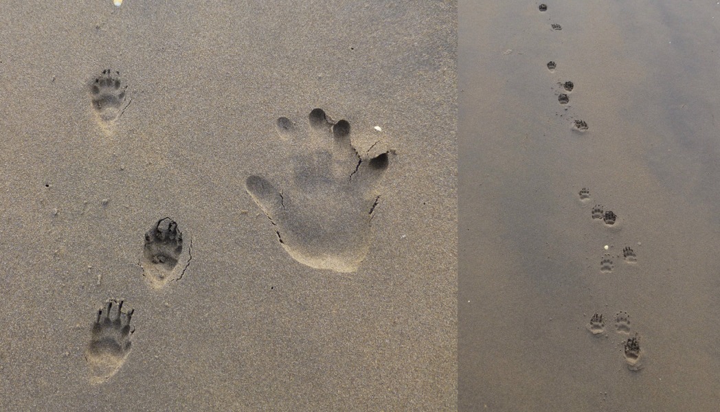 tracksThe footprints of an animal are called its tracks. The easiest to see are tracks in sand, like the otter tracks in the picture; and tracks in mud, or in snow. How do we know the tracks in the picture were made by an otter and not by a fox, a badger, a small dog, a large cat, a pine marten or a mink? My handprint shows how big the tracks are. They are too big for a mink; they have too many toes for a fox or a dog (foxes and dogs have 4 toes on all feet), and you can see the marks of the claws, so it's not a cat. A cat has retractable claws, and it only uses them to hunt, fight, or climb a tree. Badger tracks are a different shape, more square. The tracks are like those of a pine marten, but pine martens are much rarer than otters, and they never live very far from woodland. These tracks were on the end of sandy peninsula, 7km from the nearest tree, with a river on one side and the sea on the other. Perfect for an otter. It was slowing down at this point. Otters have three gaits on land. They walk, they gallop and they bound. When an otter walks, the footprints are right-left-right-left and they are all the same distance apart. When an otter bounds, you find prints of all four feet together, then a long gap, then all four feet together again, then another long gap. This otter was galloping at the bottom of the photo, but walking at the top. |